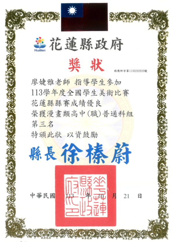 多媒科 廖婕雅老師 指導學生 參加花蓮縣113學年度全國學生美術比賽 榮獲漫畫類高中(職)普通科組 第三名 | ![]() |