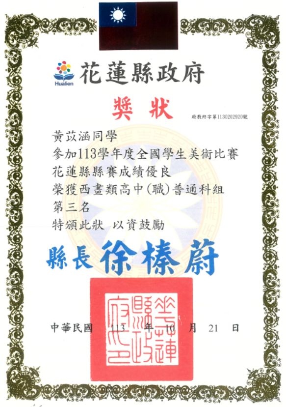 二年級—黃苡涵 參加花蓮縣113學年度全國學生美術比賽 榮獲西畫類高中(職)普通科組 第三名 | ![]() |