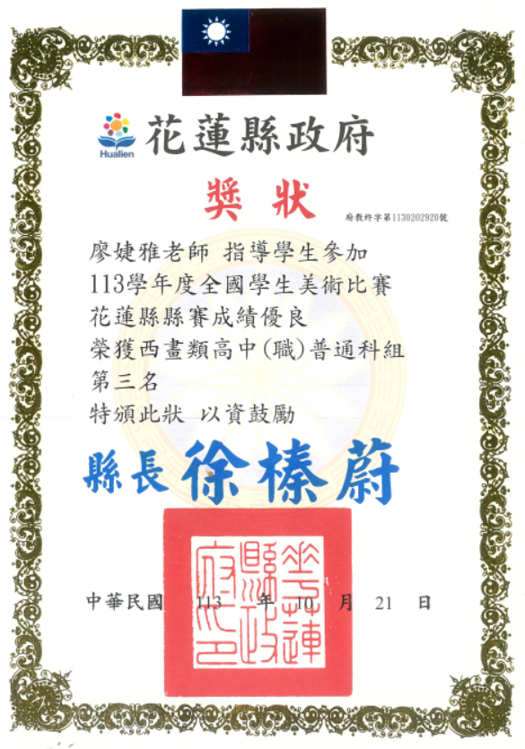 多媒科 廖婕雅老師 指導學生 參加花蓮縣113學年度全國學生美術比賽 榮獲西畫類高中(職)普通科組 第三名 | ![]() |