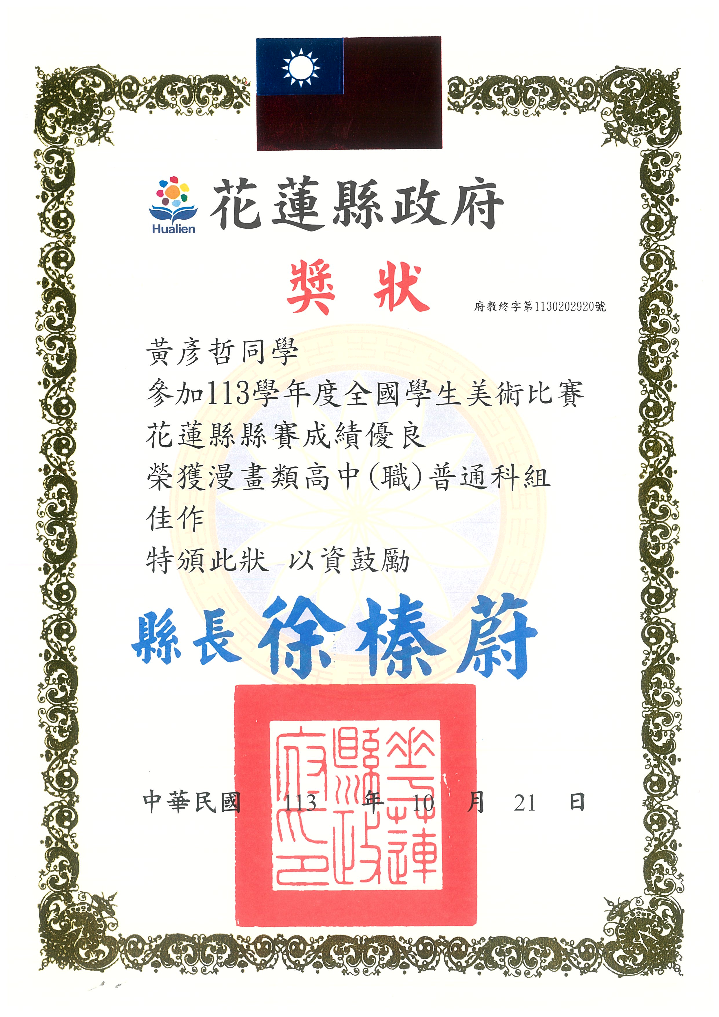 二年級—黃彥哲 參加花蓮縣113學年度全國學生美術比賽 榮獲漫畫類高中(職)普通科組 佳作 | ![]() |