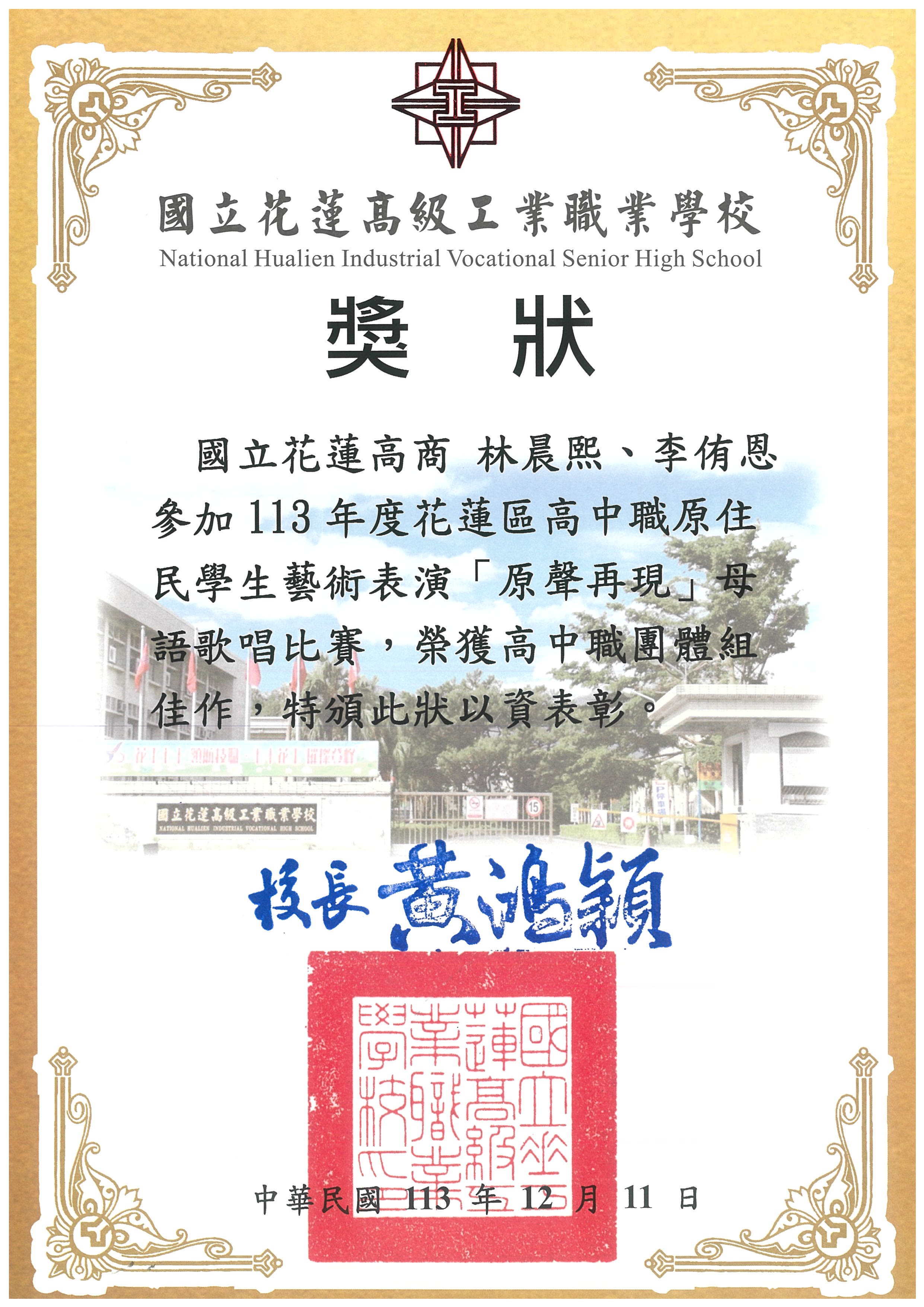 三年級—林晨熙、李侑恩 參加113年度花蓮區高中職原住民學生「原聲再現」母語歌唱比賽 榮獲 高中職團體組 佳作 | ![]() |
