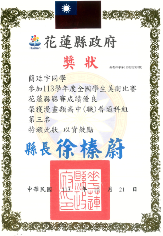 二年級—簡廷宇 參加花蓮縣113學年度全國學生美術比賽 榮獲漫畫類高中(職)普通科組 第三名 | ![]() |