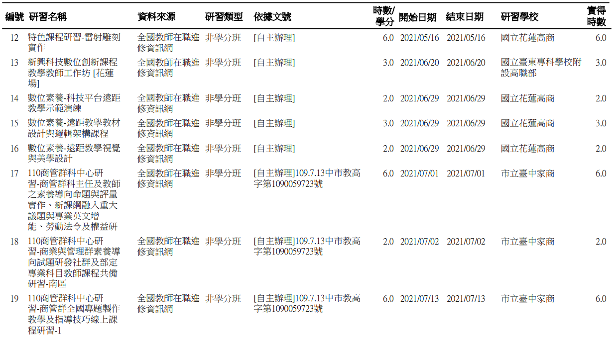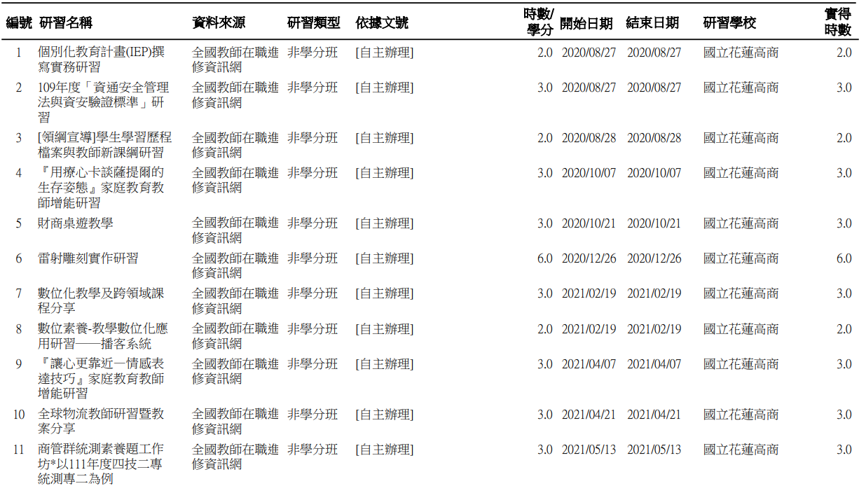 研習記錄 / 歷年研習 / 109學年度(專任:69小時)